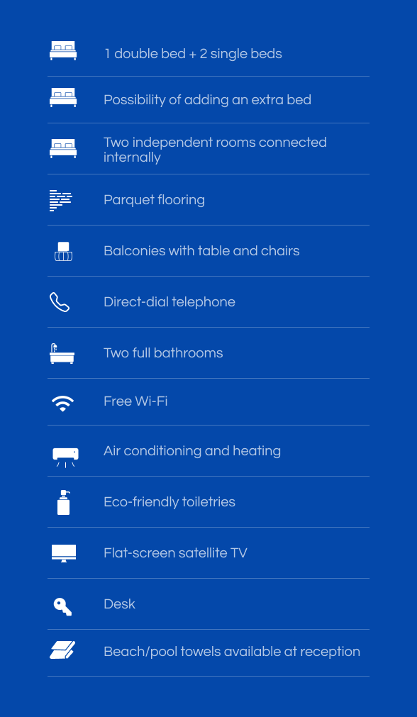 Ideal for families or groups looking for more space and comfort. Two connecting rooms that allow guests to share their stay without giving up privacy, with connected private balconies and natural light.