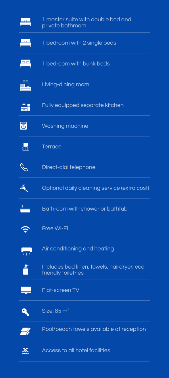 Designed for families or groups of friends, this room offers plenty of space, comfort, and a private terrace to enjoy shared moments outdoors.