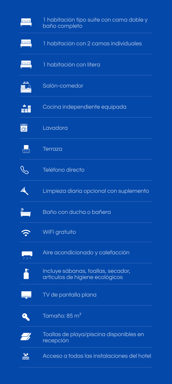 El más espacioso, ideal para grupos grandes o familias numerosas. Incluye suite con baño privado, amplias zonas comunes y una gran terraza para disfrutar del exterior.