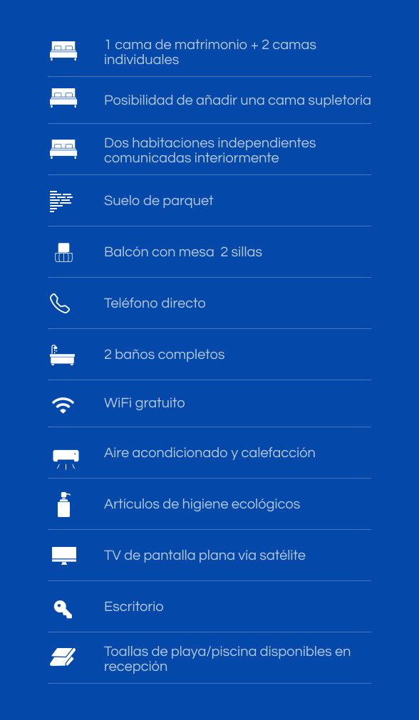 Ideal para familias o grupos que buscan más espacio y comodidad. Dos habitaciones comunicadas que permiten compartir la estancia sin renunciar a la privacidad, con balcones privados comunicados y luz natural.