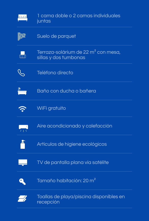 Una estancia con un plus de confort. Esta habitación se encuentra en la planta superior y cuenta con una amplia terraza-solárium privada para disfrutar del sol y la tranquilidad.