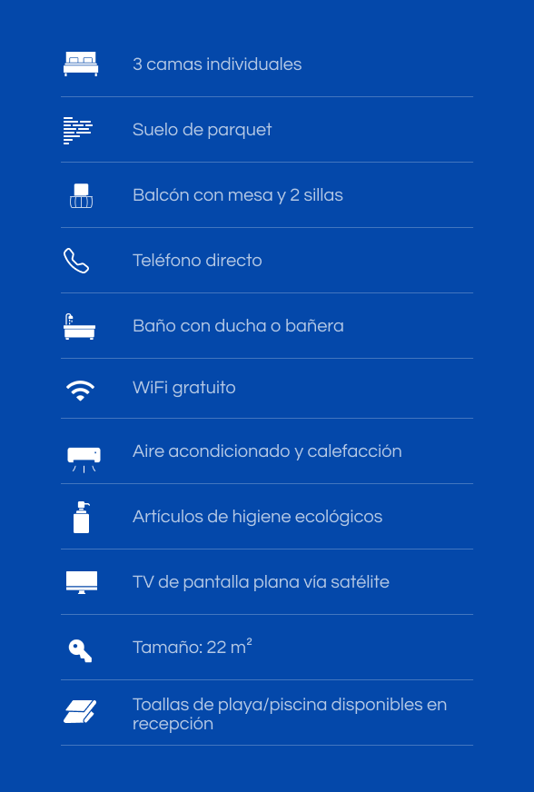 Espaciosa y confortable, pensada para pequeños grupos o familias. Las tres camas individuales ofrecen comodidad e independencia.