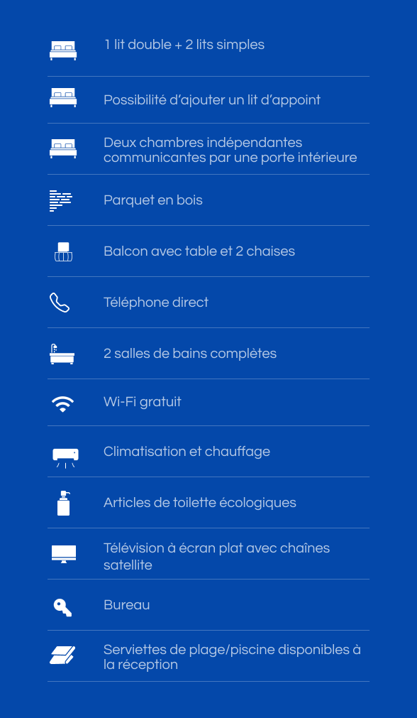 Idéale pour les familles ou les groupes à la recherche de plus d’espace et de confort. Deux chambres communicantes permettant de partager le séjour sans renoncer à l’intimité, avec des balcons privés communicants et une belle lumière naturelle.