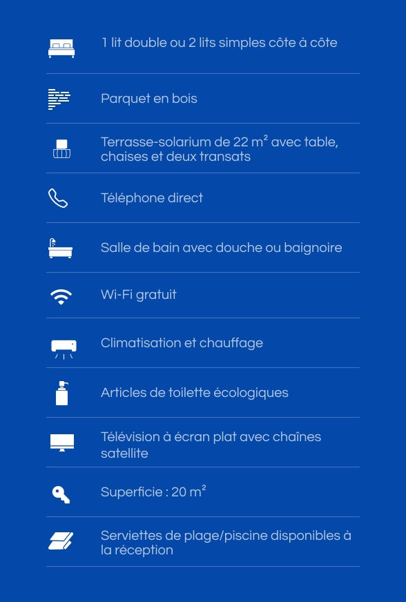 Un séjour avec un supplément de confort. Située à l’étage supérieur, cette chambre dispose d’une grande terrasse-solarium privée pour profiter du soleil et de la tranquillité.