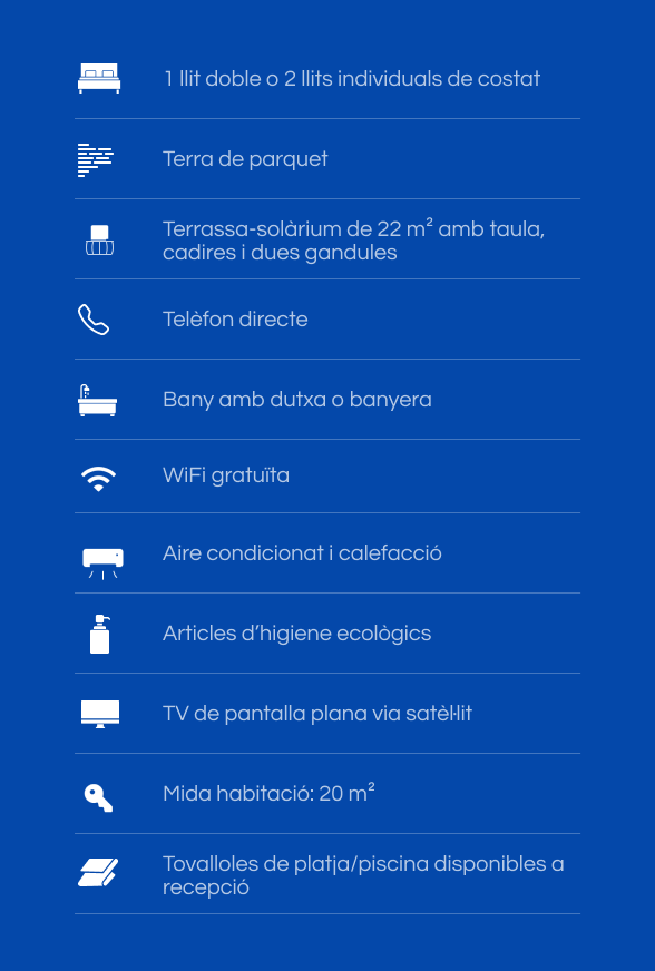 Una estada amb un plus de confort. Aquesta habitació es troba a la planta superior i compta amb una àmplia terrassa-solàrium privada per gaudir del sol i la tranquil·litat.